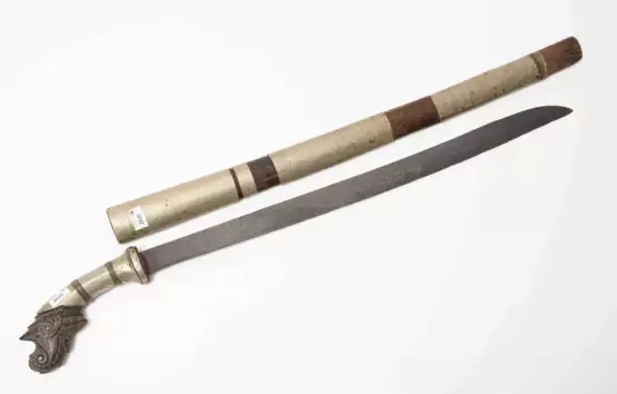 Indonesien, Lombok, um 1880. Griffstück mit fein floral und geometrisch beschnitzem Abschluss. Die Hilze mit Neusilberblech beschlagen. Korr. einschneidige Hauklinge (L 55 cm) von keilförmigem Querschnitt, mit deutlich sichtbarer Lagenstruktur. Holzscheide mit Zierhülsen aus unverziertem Neusilber / Weissmetall beschlagen. Scheidenabschluss fehlt. L 71 cm.
