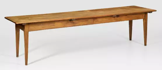 Fichten- und Buchenholz. Gerade Zarge auf konischen Vierkantbeinen sowie weit überstehende, rechteckige Deckplatte. H. 77 cm. 298 cm x 77 cm.