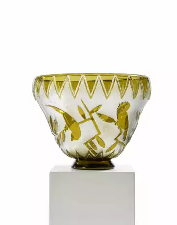 Technique: Colorless glass, green overlay, acid-etched.