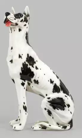 Fayence. Vollplastische, naturalistische Darstellung des sitzenden, schwarz-weiß gefleckten Hundes mit aufmerksam erhobenem Kopf. Polychrom staffiert. Ger. Glasurdefekte. H. 102 cm.