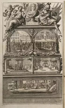 I) VD17 12:127106X. Lipperheide Sba 16. - Festbeschreibung der Wahl Josephs I. zum römisch-deutschen König. - II) VD17 12:127103Z. Lipperheide 15. - Festbeschreibung der Krönung der Eleonora Magdalena Theresia von der Pfalz zur Kaiserin. - Leicht gebräunt, kaum fl.. Einband berieb. u. best.