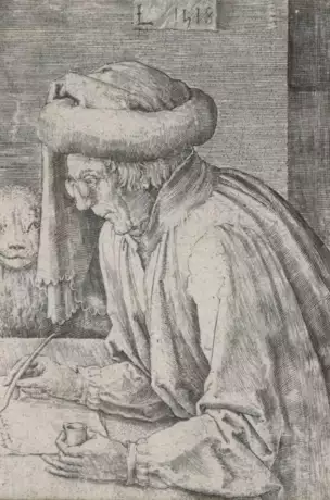 (1494 Leiden 1533). Markus. Kupferstich, 1518. Passepartout-Ausschnitt 10,7 x 7,1 cm. I.d.Pl. monogr. u. dat. Hint. Passep. u. Gl. ger. (nicht ausgerahmt).