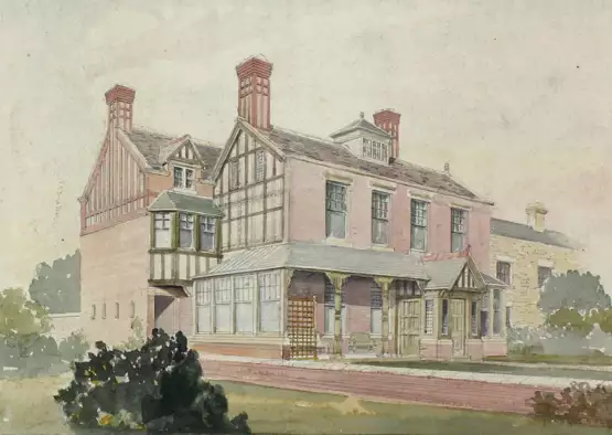 Zeichnung der historischen Old Hall. Im Verzeichnis der "National Heritage List for England" zu finden. - Altersübliche Gebrauchssp. ╔Dabei: Aquarellierte Zeichnung. Innenraum,╗ von Lady Lennox, um 1830/1840. Möglicherweise die Frau von Lord Arthur Lennox. Ca. 22 x 32 cm. Unter Passep. mont. Verso sign. bzw. zugeschrieben.