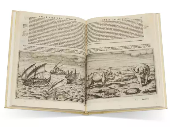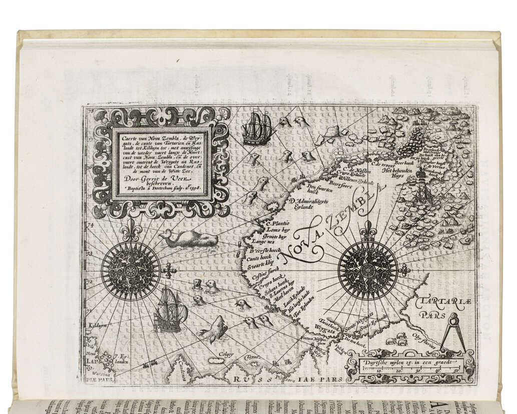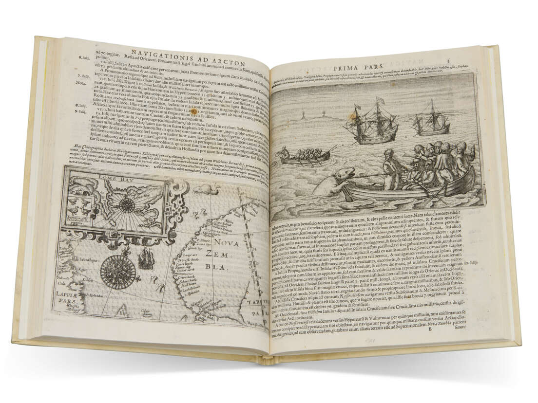 2 works bound in one volume, quarto (302 x 220mm). I: Latin edition, large engraved map of the Eastern Hemisphere on title possibly showing the tip of Australia, one plate, and 47 illustrations, including 4 maps, woodcut coastal profiles and illustrations, woodcut initials (lacking the double-page plate of the Bantam Market as usual, spots to B3 and K1, repaired tear to C2 affecting a few letters, leaf G1 folded with repairs at fore-edge just affecting extremity of engraved image, tiny wormhole from H3 through to end of second work affecting images and a few letters, M4 with two repairs just into text and image, engraved plate at end lightly stained). II: Latin edition, 26 half-page engraved scenes of Arctic exploration, a fine full-page map ‘Caerte van Nova Zembla’ engraved by Baptista a Doetechum, and 4 other maps (without final blank L4, title and first gathering lightly stained, A2 torn in half and repaired affecting a few letters, a couple of spots to A4-B1, printing flaw to B2r affecting a few letters; the whole washed and pressed, some illustrations previously censored now revealed from washing). Recent vellum (covers slightly bowed).