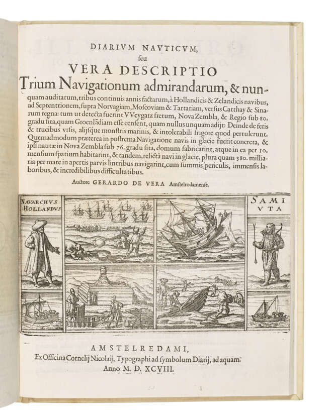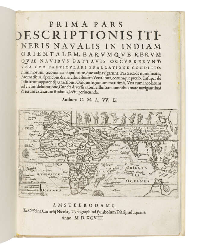 Prima pars descriptionis itineris navalis in Indiam orientalem. Amsterdam: Cornelis Nicolas, 1598. [Bound with:] – VEER, Gerrit de. Diarium nauticum seu vera descriptio trium navigationum admirandum. Amsterdam: Cornells Claeszoon, 1598.