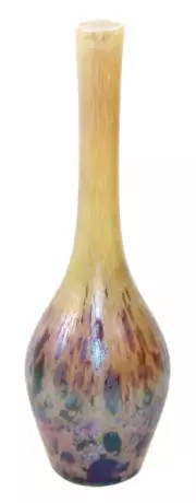 um 1900. Flaschen- bzw. Keulenvase mit Dekor Candia Papillon in gelb u. violett. H: 32 cm.