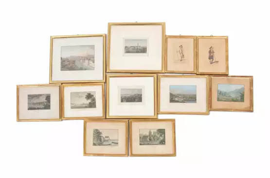 Rechteckige Holzrahmen übereck vergoldet, diverse Sujets. 16x12,5 cm bis 21,5x23,5 cm.