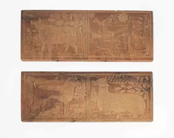Deutsch, um 1820. Holz mit vertieft geschnitzten Motiven. Längsrechteckig. Je 2 Darstellungen. Löwe mit 2 Jungen und Hirsch bzw. Bär und Husar. Je 14x38 cm.
