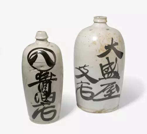 Japan, 20.Jh. Steinzeug mit weisser Glasur. Zwei bauchige Gefässe mit schwarzer Beschriftung. H 36/40 cm.