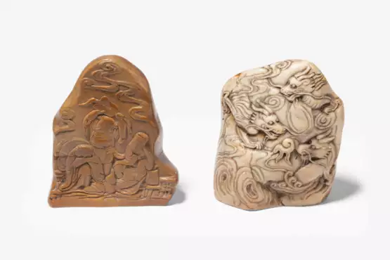 China. Cremefarbener bzw. karamellfarbener Stein. Siegelstein beschnitzt mit Drachen bzw. Gelehrtengruppe. H 9/ 10 cm.