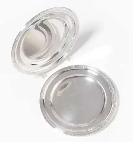 Silber, Gemarkt Lazarus Posen. Rundform mit profiliertem Rand und Kreuzbanddekor. Bodenunterseite mit gravierter Widmung. Halbmond/Krone, Feingehalt 800. D 23 cm, ca. 700 g.