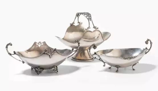 Silber. Ovale Formen, auf Volutenfüssen, bzw. auf Rundfuss. Feingehalt 800–900. L 18,5–20,5 cm, zus. ca. 503 g.