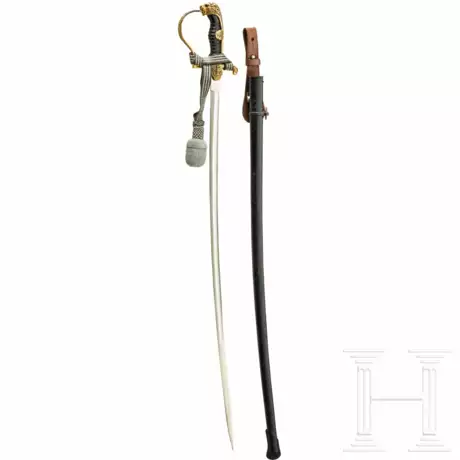 Beidseitig gekehlte Rückenklinge mit Herstellerlogo unter dem quartseitigen Parierlappen, dabei der Lieferantenstempel "Albert Kuhl Münster-Esse". Vergoldetes Eisenbügelgefäß mit reliefiertem Dekor, Löwenkopfkappe mit roten Glasaugen, schwarze Kunststoffhilze mit Drahtwicklung, Portepee (kleine Risse). Schwarz lackierte Eisenscheide (berieben, Rostspuren) mit einem beweglichen Tragering, daran ein Clip aus braunem Leder. Gebrauchs- und Altersspuren. Länge 95 cm.
