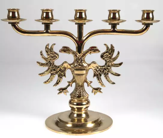 Лот 542 | Lübecker Senatsleuchter, Messing, 5-flammig, auf rundem Fuß, figürlicher Schaft mit Doppelkopfadler mit Brustschild, H. 26,5 cm