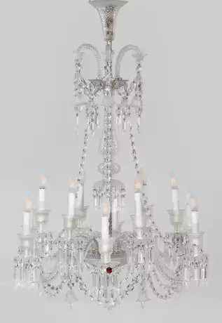 Serie No. 4. 12-flg.; Farbloses Kristallglas. Mehrfach gegliederter Balusterschaft. Unterhalb davon ausgehend stark geschwungene, in sich gedrehte Leuchterarme als Träger für Leuchtmittel. Tief gemuldete Traufschalen mit flächendeckendem Steinelschliff und kelchförmige Tüllen. Korrespondierender oberer Abschluss. Reicher Behang aus facettierten Prismenstäben, Glockenmotiven und Prismenschnüren. Herstellerzeichen in Form einer rubinroten Kristallprisma mit graviertem B. Elektrifiziert. Zwei Arme beschädigt. H. 110 cm. D. 78 cm.