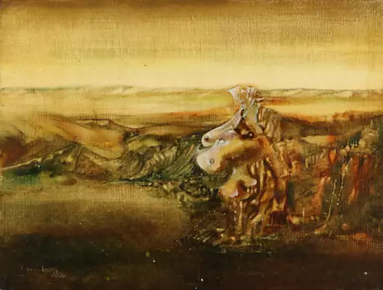 (1936) Landschaft mit antropomorphen Zügen. Öl auf Platte. 1966. Dat. u. sign. 30,1 x 40 cm. Gerahmt.