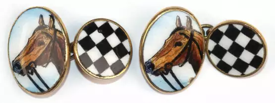 Лот 874 | Manschettenknöpfe, um 1920, emailliert, vergoldet, ovale Schauseite mit Pferdemotiv, 2x1,5 cm