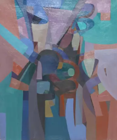 (1936 Lecce). Abstrakte Kompositon. Öl auf Lwd. 1976. 55 x 46 cm. Verso ob. sign. u. dat. Auf Holzrahmen gespannt. - Vereinz. kl. Farbabplatzungen (meist am äußeren Rand).