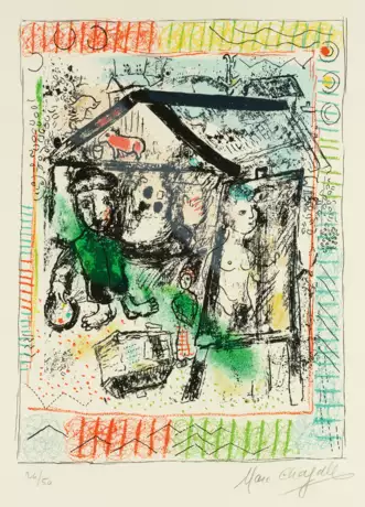 In der zweiten Variante dieses Motivs wurden von Chagall die Rahmung und die Farben verändert, aber auch eine weitere schwarze Grundzeichnung hinzugefügt, die zuletzt gedruckt wurde und die Schwarzzeichnung der ersten Graphik ergänzt.