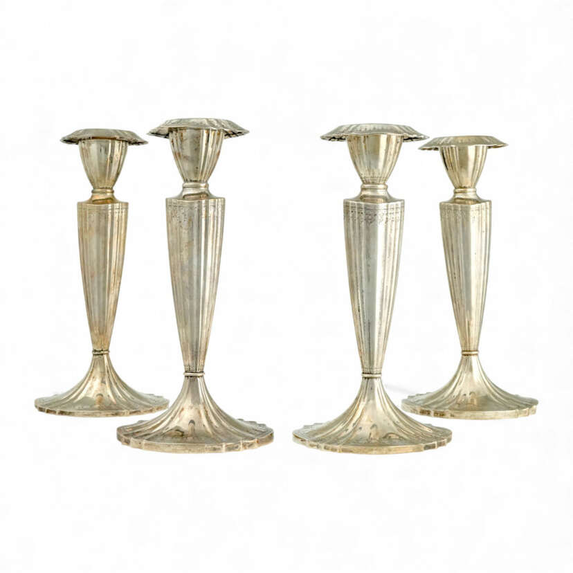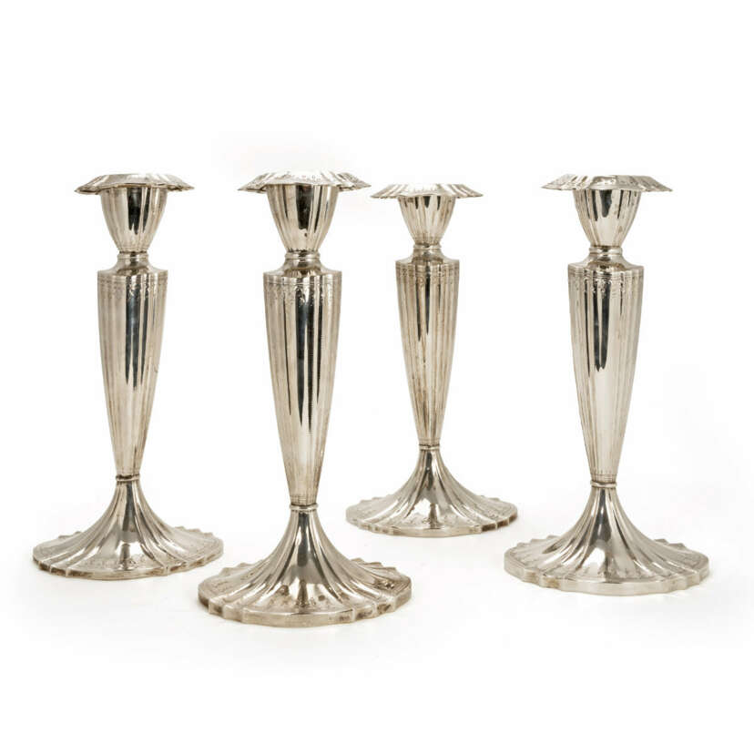 4-piece set, Marcus & Co, New York, c. 1900, 925 silver, hallmarked, each single-flame floor candlestick with fluted, conical column shaft tapering downwards on a multi-cornered foot, stepped spout with attached multi-cornered drip tray, maker's mark, fineness and model number 01090, height 25 cm - 25.5 cm, total weight (filled) approx. 2114 g, minor signs of wear, 2 candlesticks slightly crooked, drip tray of 2 candlesticks not removable