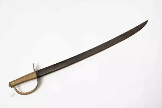 Frankreich, Chatellerault, dat. "Mai 1841". Bügelgefäss aus Eisen mit goldfarbener Fassung. Die Handschutzglocke ist nicht erhalten. Achteckige Hilze aus Eisen en suite. Beidseitig breit gekehlte Rückenklinge (L 67,5 cm) mit Rückenspitze und ca. 1 cm langer Fehlschärfe. Am Rücken sign. "Manufacture Royale de Chatellerault Mai 1841". Auf der Stärke ist jeweils ein Anker eingraviert. L 82 cm.
