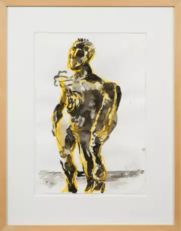 Mit kraftvollen Tuschstrichen in Schwarzu und Grau sowie gelber Kreide skizzierte, heroische Darstellung des stehenden Herkules, mit der Keule in seiner Linken und das Fell des Nemeischen Löwen über der Schulter tragend. 2003 geschaffene, neoexpressionistische wohl als Studienblatt zu der im gleichen Jahr geschaffenen Skulptur des antiken Halbgottes. Die antike Mythologie und das Dionysische ist ein beliebtes Thema im Oeuvre Lüpertz', mit dem er sich intensiv auseinandersetzt. Ab 1961 freischaffend in Düsseldorf tätig, zog der Künstler 1962 nach Berlin, wo er rasch Anschluss an gleichgesinnte Künstler fand und seine eigentliche malerische Laufbahn begann. 1973-1986 lehrte er an der Staatlichen Akademie der Bildenden Künste in Karlsruhe und wirkte 1988-2009 als Rektor an der Staatlichen Kunstakademie in Düsseldorf. Lüpertz zählt zu den bedeutendsten deutschen Künstlern der Gegenwart und gehört neben Baselitz, Immendorff und Penck zu den wichtigsten Repräsentanten des Neoexpressionismus, aus dem um 1980 die sog. "Neuen Wilden" hervorgingen. Mischtechnik mit Tusche und Fettkreide/Papier. R. u. monogr. (eingekreist); Verso Galerieetikett. 50 cm x 35 cm. Rahmen.