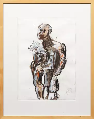 Mit kraftvollen, sich dicht überlagernden Strichen skizzierte, heroische Darstellung des Herkules, der die charakteristische Keule in seiner Rechten hält und das Fell des Nemeischen Löwen über der Schulter trägt. 2003 geschaffene, neoexpressionistische wohl als Studienblatt zu der im gleichen Jahr geschaffenen Skulptur des antiken Halbgottes. Die antike Mythologie und das Dionysische ist ein beliebtes Thema im Oeuvre Lüpertz', mit dem er sich intensiv auseinandersetzt. Ab 1961 freischaffend in Düsseldorf tätig, zog der Künstler 1962 nach Berlin, wo er rasch Anschluss an gleichgesinnte Künstler fand und seine eigentliche malerische Laufbahn begann. 1973-1986 lehrte er an der Staatlichen Akademie der Bildenden Künste in Karlsruhe und wirkte 1988-2009 als Rektor an der Staatlichen Kunstakademie in Düsseldorf. Lüpertz zählt zu den bedeutendsten deutschen Künstlern der Gegenwart und gehört neben Baselitz, Immendorff und Penck zu den wichtigsten Repräsentanten des Neoexpressionsmus, aus dem um 1980 die sog. "Neuen Wilden" hervorgingen. Mischtechnik mit Öl und Fettkreide/Papier. R. u. monogr. (eingekreist); Verso Galerieetikett. 50 cm x 35 cm. Rahmen.