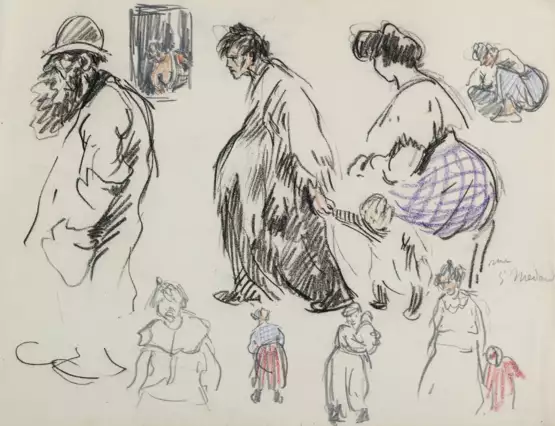 Vorhanden: Blatt mit 4 sitzenden Frauen, handschr. bez. "Jardin des plantes" u. dat. "Paris 1911". - Blatt mit Studie eines bärtigen alten Mannes u. 7 Studien von gehenden, sitzenden oder stehenden Frauen tls. mit Kind, rechts bez. "rue S.Medard". - Blatt mit einer Biergarten- oder Kaffee-Szene, einer Studie mit Menschen unter einem Schirm u. einer stillenden Frau.