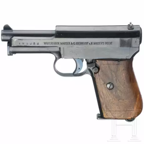 Kal. 7,65mmBrowning, Nr. 185098, nummerngleich. Leicht matter Lauf, Länge 85 mm. Beschuss Doppelkrone/U. Links am Verschluss einzeilige Firmierung, rechts Kaliber. Originale Brünierung mit Tragespuren. Abzug gebläut. Einteilige Holzgriffschale. Magazin mit eckigem Boden.