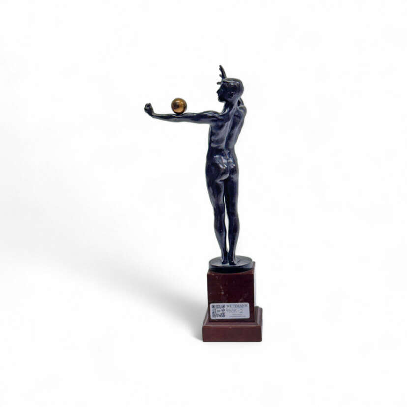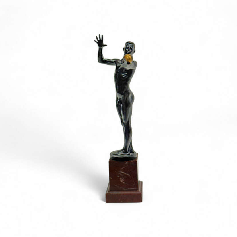 Male nude with ball, bronze with dark patina on square marble plinth, height 45.5 cm, width approx. 20 cm, base 10 × 10 cm, bronze signed, inscribed ''Akt. Ges. v. H. Gladenbeck & Sohn''
