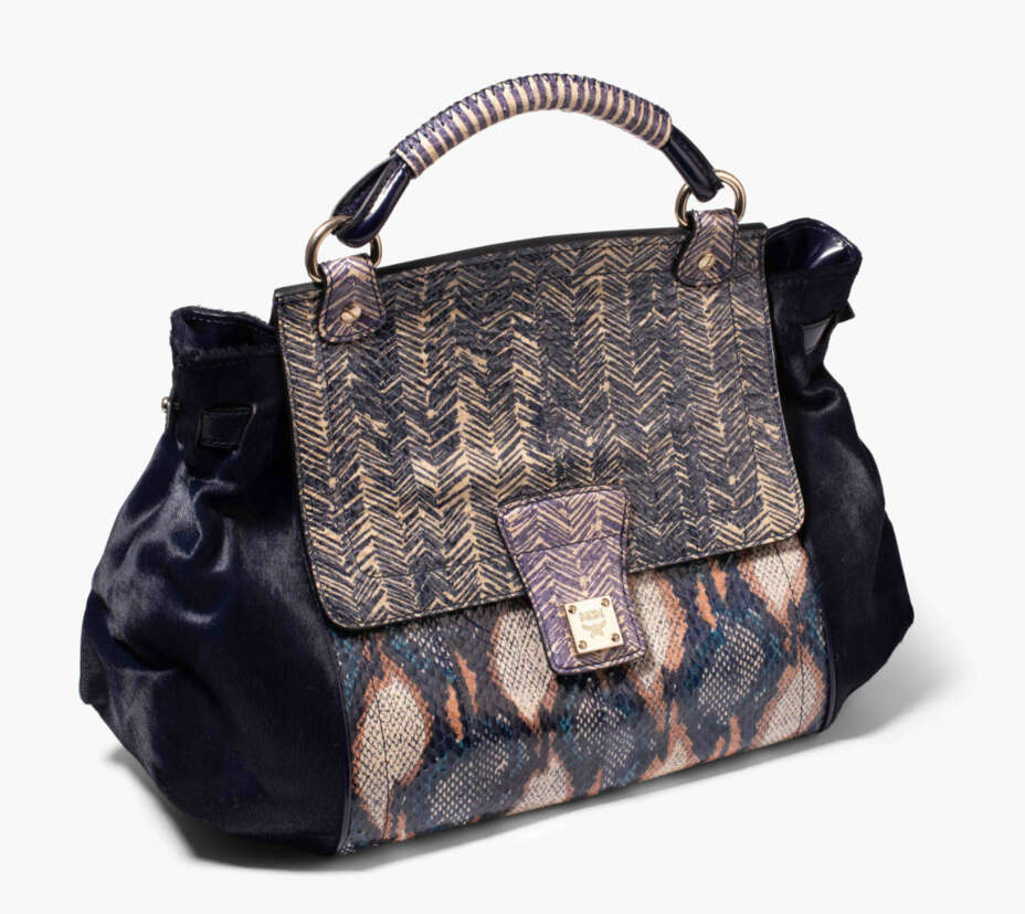 Aus dunkelblauem Glattleder, blau-beigem Pythonleder und dunkelblauem Ponyfell. Goldfarbene Metallbeschläge. Abgerundeter Tragegriff. Abnehmbarer Schulterriemen. Überschlag mit Steckverschluss. Mit Originalstaubbeutel. 40x28x16 cm.