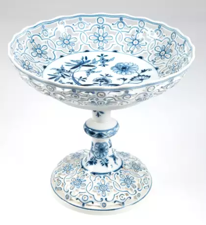 Лот 413 | Meissen-Aufsatzschale, Zwiebelmuster, um 1900, Schalenrand und Fuß floral und ornamental durchbrochen, Knaufschwertermarke mit 2 Schleifstrichen, H. 21 cm, Dm. 24 m
