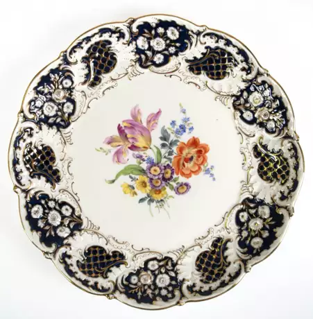 Лот 403 | Meissen-Prunkteller, rund, reliefierter Rand mit goldstaffiertem Floral- und Akanthusblattdekor, im Spiegel Buntes Blumenbukett, blaue Schwertermarke, 1. Wahl, Dm. 29 cm
