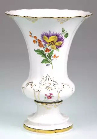 Лот 425 | Meissen-Prunkvase, kannelierte Wandung mit gewelltem Goldrand, Bunte Blume 2 und Golddekor, verschraubter Fuß mit Goldrand, 1. Wahl, H. 24,5 cm