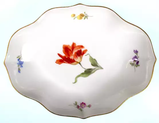 Лот 462 | Meißen-Schälchen, vierpaßförmig, Bunte Blume 1 mit Goldrand, blaue Schwertermarke mit 2 Schleifstrichen, L. 19 cm