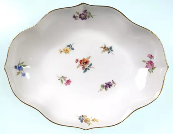 Лот 463 | Meißen-Schälchen, vierpaßförmig, Streublume mit Goldrand, blaue Schwertermarke mit 2 Schleifstrichen, L. 19 cm