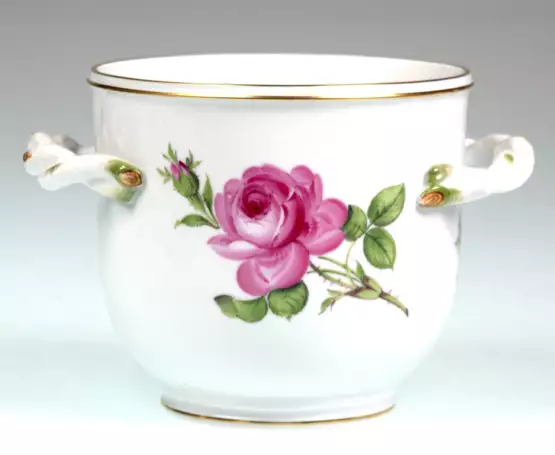 Лот 445 | Meissen-Übertopf, Rote Rose mit Goldrand, seitl. 2 gedrehte Henkel, H. 10,5 cm, Innen-Dm. 11 cm