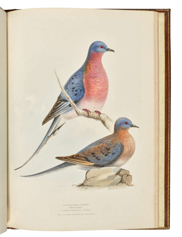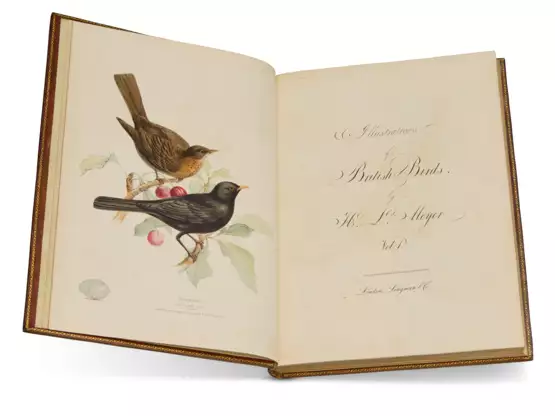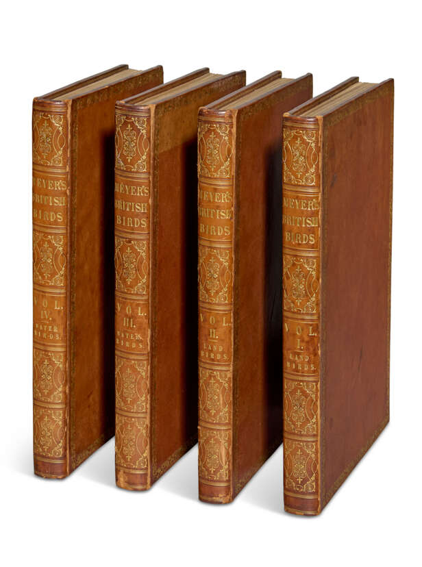 4 vols, folio (360 x 2600mm). 321 fine hand-coloured lithographic plates, including five of birds' eggs not called for in the lists of plates, with the 1841 replacement plates of the Blackbird and Heron bound as the frontispiece to vol. I and as plate 3 in vol. III respectively [‘The 1841 replacement plate[s] prepared for the third edition but circulated (probably unintentionally) to subscribers of the first edition’ (Hale plates 12 and 13)], 4 lithographic title-pages and 4 lithographic lists of plates (frontispiece to vol. III trimmed into caption, scattered variable spotting and browning, heavier to the plates of the Bearded Titmouse, Snowy Owl and Canada Owl in vol. I, Reed Bunting in vol. II, and at beginning of vol. III). Contemporary polished russia, covers with outer border of gilt foliate scroll tool, flat spines ruled in gilt into 6 compartments, lettered in the second and fourth, the others ornately gilt with borders composed of cornerpieces of volutes and foliate tools joined by single filet arcs enclosing centrepieces of volutes and flower stems with small circles, gilt turn-ins and edges, pale yellow glazed endpapers (extremities lightly rubbed, joints fractionally more heavily, upper cover of vol. III fractionally unevenly sunned). Provenance: Maria Alicia Joanna Nightingale (1835-1886, of Ludlow, Shropshire, daughter of Allen Jackson Nightingale [1786-1844], listed as a subscriber to this work; ink ownership inscription on front free endpaper dated January 26th 1867 with a note in another hand erroneously describing her as being the sister of Florence Nightingale, with a clipped signature of the latter pasted onto the endpaper) – Francis Trevelyan Buckland (1826-1880, naturalist; pasted onto front flyleaf of vol. II is autograph note signed ‘F. Buckland’ responding to a note dated 16 November 1867 from ?Louis Frase from ‘The Polytechnic’ on Regent Street regarding the accidental poisoning of birds) – Michael Tomkinson (1841-1921, businessman and collector, Mayor of Kidderminster in 1887 and Sheriff of Nottingham in 1892; armorial bookplate of Franche Hall, Worcestershire).