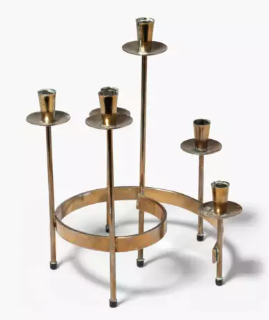 Schweden, 1950er Jahre. Metall, goldfarben patiniert. 6-flammig. Bezeichnet "MADE IN SWEDEN". H 24,5 cm.