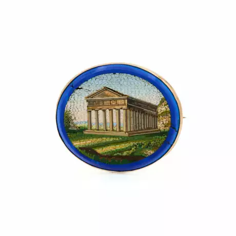 Description: Simple rose gold brooch with a filigree mosaic of glass tesserae depicting a temple motif.