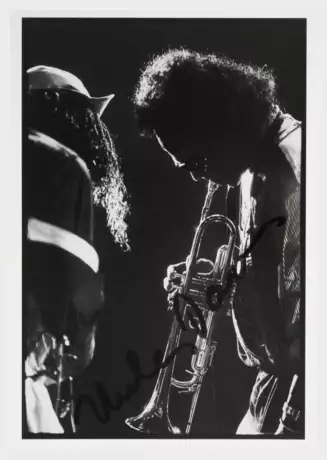 S/W-Porträtfoto des US-amerikanischen Jazz-Trompeters Miles Davis (1926-1991) während eines Auftritts, mit Unterschrift. Fotograf: Edouard Curchod. Minim. Altersspuren. 15,2 cm x 10,7 cm.