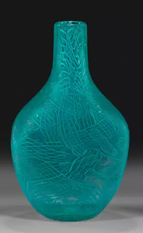 Farbloses Glas mit flächendeckendem "Millefili"-Dekor in Türkis-Grün. H. 30 cm.