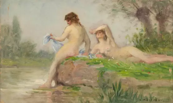(1856-1899). Zwei weibliche Akte am Flussufer. Öl/Lwd./Karton. 23,5 x 40 cm. Signiert. Gerahmt.