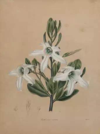 Лот 245 | Mills "Anthocercis viscosa", kolorierte Grafik, Blatt gebräunt und leicht fleckig, 22x16 cm, im Passepartout hinter Glas und Rahmen