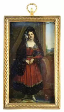 Spanierin. Öl auf Karton. Mitte 19. Jh. 10 x 6 cm. In vergoldeten Messinrahmen.