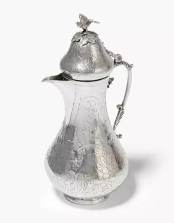 Orientalisch. Silber. Bauchiges Kännchen mit ziseliertem Blumendekor. Je zwei Punzen auf Korpus und Deckel. Knauf mit vollplastischem Vogel. H 22 cm. Ca. 371g.