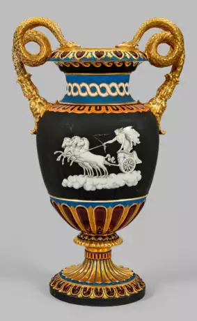 Feinsteinzeug. Über hochgezogenem Rundfuß mit Nodus ovoider Korpus aus Biskuitporzellan mit eingezogenem Hals, in weit ausschwingenden Mündungsrand übergehend. Umlaufende ornamentale Reliefbordüren aus Eierstab, Zungenblatt sowie Wellenband und architektonischem Fries. Von der gerundeten Schulter ausgehend zwei, aus stark reliefplastischen Akanthusblättern aufsteigende, spiralförmig eingerollte Schlangenhenkel. Flächendeckender matter Fond in Schwarz und Blau. Beidseitig zentral der Wandung die mythologische Darstellung des auf Wolken schwebenden, von Apollo bzw. Diana geführten Streitwagens mit Viergespann, respektive zwei Personen in hellem, Marmor imitierendem Umrissdekor. Nach grafischer Vorlage von Tommaso Piroli. Polychrome Malerei mit reicher Goldstaffage. Form-Entw. nach einem Modell von Ernst August Leuteritz für die Porzellan-Manufaktur Meissen. Dat. "1867". Öffnung mit verschraubter Holzplatte. Ber.; Manufakturmarke. H. 101 cm.