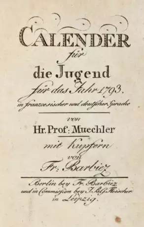 Köhring 45. Lanck./R. 159; Rüiii., Kinderb. 254 u. Wegehaupt 1462 (alle mit abw. Tit.). - Nach Umfang u. Inhalt wohl identisch mit dem ebenfalls für 1793 erschien. »Etrennes pour la jeunesse/Taschenbuch für die Jugend« v. Müchler (von allen oben gen. Bibliogm. so zitiert). Vorlieg. Ex. offenbar eine Variante mit leicht abgeändertem Titelbl. - Reizender Almanach für die Jungend, Text zweisprachig, enthält Erzählungen, Gedichte, Fabeln u. Sprüche, SS. 1-67 "Die Geschichte des Prinzens Li-Bou, dem Sohne eines Südseehäuptlings, eine Art Robinsonade mit sehr gefühlvollem Einschlag" (Lanck./R.). - Exlibris. - Selten.