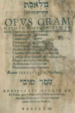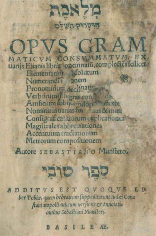 VD16 M 6721. Burmeister 11. Fürst II, 407. Prijs 62. Sehr seltene, erste Ausgabe über die hebräische Grammatik auf Grund der Schriften des Elias Levita; mit dem seltenen Anhang (mit eigenem Titel) über das apokryphe Buch Tobias (ben Tobiel). - Stark restauriertes und gereinigtes Exemplar, fleckig, Titel u. Vorwort mit ergänzten Randfehlstellen (geringer Textverlust).