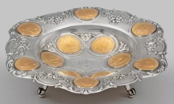 A German silver coin bowl in honor of Emperor Friedrich with 12 inlaid gold coins from 1888. Monogrammed. Standard mark 800, maker´s mark.